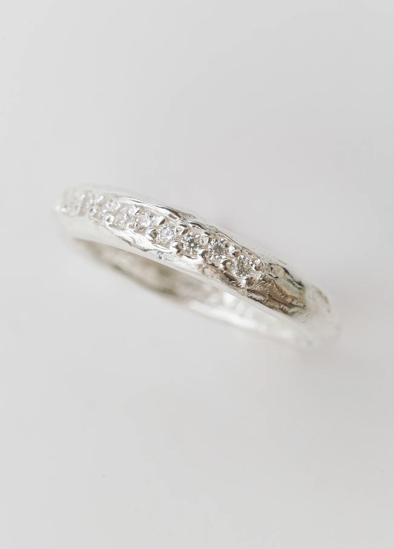 Casilda es un anillo eternidad (half eternity) con circonitas talladas engarzadas. Es rugoso, con un acabado que recuerda a los anillos antiguos, reliquias como las de nuestra colección Éxodo que son joyas familiares de la Antigua Mesopotamia para llevar en el día a día o en ocasiones especiales.