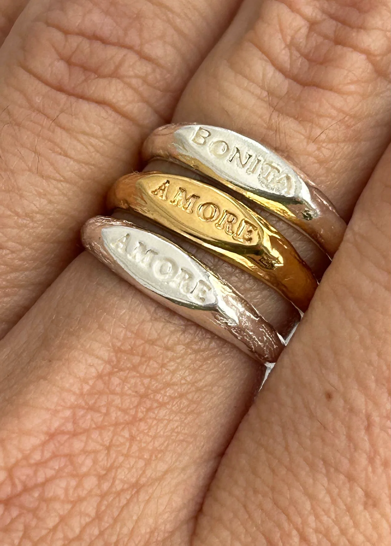 El anillo sello mini Amore es un sello perfecto para el dedo meñique, con letras romanas y un mensaje claro e importante en la vida: AMORE, amor en italiano. Es el regalo perfecto para uno mismo o para el "L'amore della tua vita". Está hecho enteramente en plata 925 para que dure eternamente. Las tallas son pequeñas porque está pensado para ser un sello de meñique. Generalmente una 4 o 6 es para un dedo meñique de mujer y la 12 es para un dedo meñique de hombre o un dedo anular de mujer.