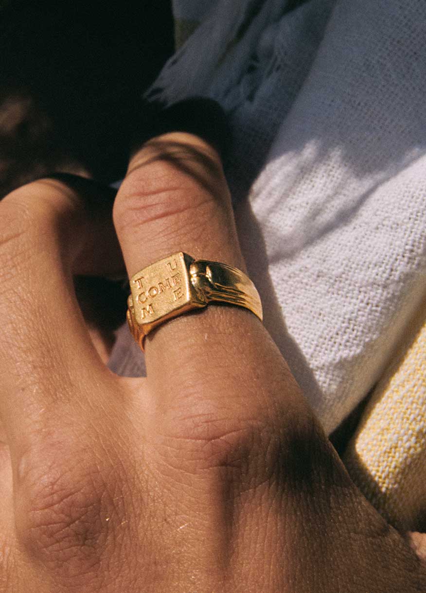 TU COME ME es un anillo con una nota de amor que se lleva pegada a la piel. La inspiración de este anillo se remonta a la infancia de Giovanni Zattera, donde la música, como un río invisible, fluía por la ventana de esa casa de la Costa Amalfitana y llenaba el aire con su vibración dulce y provocadora. Entre esas melodías, resonaba una canción pop que le marcó y que decía "tu come me", tú como yo, una nota de amor en italiano y que en español le da otro sentido pícaro y divertido, pues significa "tú puedes comerme".
