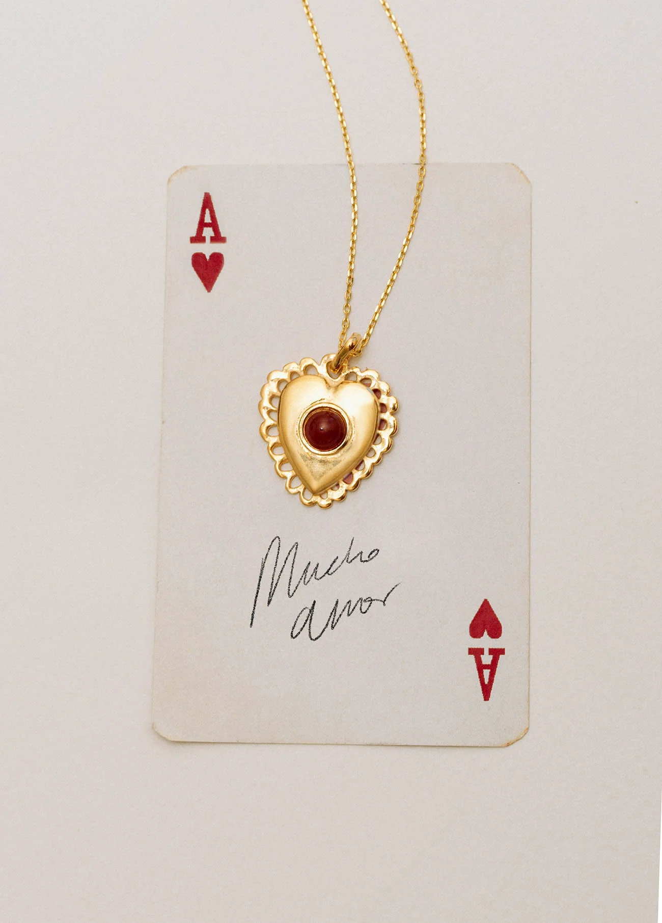 Colgante Corazón muy romántico con piedra Ágata granate bañado en oro de 18k. El color rojo oscuro es un color muy potente asociado a pasión y emociones intensas. Para las culturas mediterráneas las historias de amor están fuertemente ligadas a la pasión y por eso nuestro corazón combina el romanticismo y la pasión en su diseño.