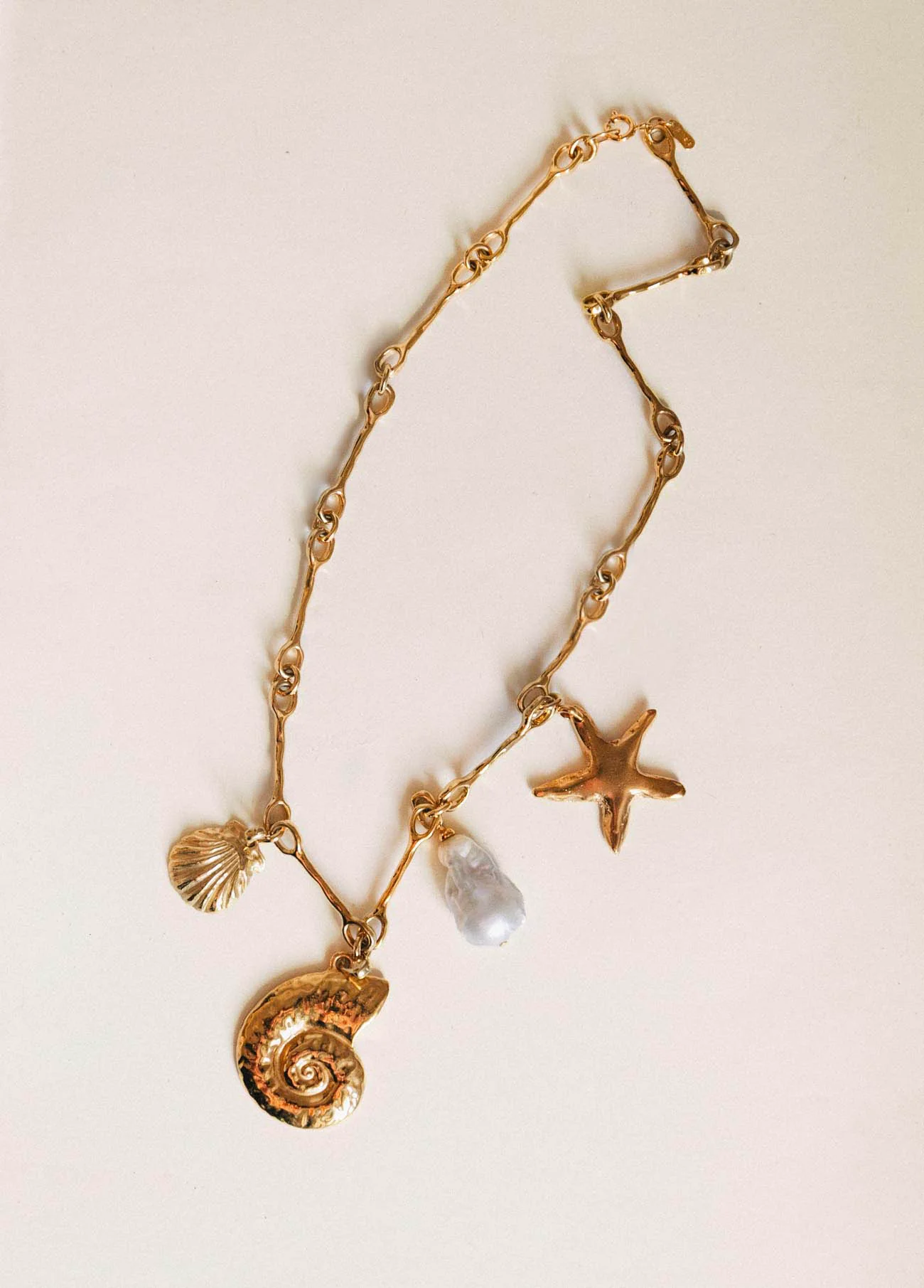 El Collar Calypso es una oda al mar y a sus secretos mejor guardados. En su base, la cadena Nautilus, con eslabones irregulares ensamblados a mano y bañada en oro de 18k, evoca el vaivén de las olas y la belleza orgánica del océano.