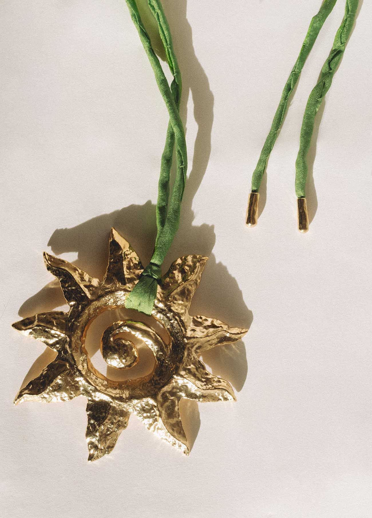 Este collar juega con la armonía de los contrastes: la calidez e intensidad del sol y la suavidad y ligereza de la seda.